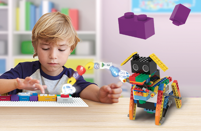 codare. Prin potrivirea cuburilor de funcții și parametri, copilul creează un set de comenzi pe